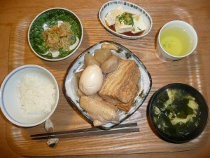 おでん、きゅうりのナマス、湯豆腐、ワカメと玉子のお澄まし おでんの具は玉子、ごぼ天、平天、コンニャク、大根、手羽先、じゃがいも、厚揚げ、ちくわと沢山沢山ありました。おでんだけでお腹一杯になりました。