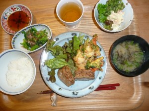海老のかき揚げとれんこんのはさみ揚げレタス添え、ポテトサラダブロッコリーレタス添え、菜花のおひたし、もずくとねぎのお味噌汁 かき揚げの海老がぷりぷりして凄く美味しかったです。もずくが少し塩辛くてお味噌汁が辛かったのが残念でした。今日もお野菜一杯の健康的なメニューでした。
