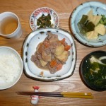 肉じゃが、大根の葉の炒め物、竹の子とワカメと揚げ豆腐と小松菜の煮浸し、ワカメと揚げのおうどん 旬の竹の子の煮浸しがとても美味しかったです。大根の葉もかつおと炒められていて食欲をそそりました。おうどんもお揚げさんが甘く煮てありとても美味しかったです。肉じゃがの肉が細かく切られていてやわらかくて食べやすかったです。