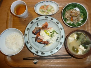 さけのムニエル塩麹焼きタルタルソースがけ、切り干し大根、きゅうりと大根と人参の酢味噌和え、豆腐とワカメとキャベツのお味噌汁 ムニエルの塩加減がとても良くてソースもあっていて美味しかったです。切り干し大根には人参やしいたけや揚げが入っていてやわらかく甘く美味しく煮られていました。