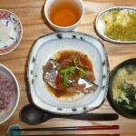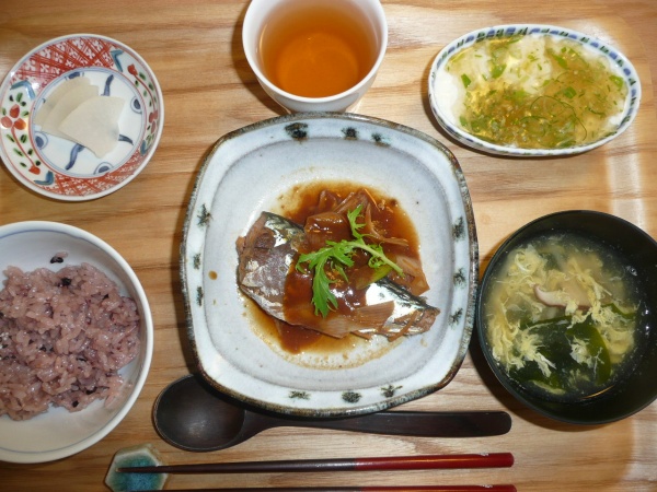 さばの味噌煮長ネギ添え、ねぎのあんかけおぼろ豆腐、お赤飯、たくわん、大根と玉子としいたけとわかめのお澄まし 今日はデイの誰かの誕生日かお赤飯でした。もちもちして美味しかったです。おぼろ豆腐もねぎのあんがとてもあっていました。さばの味噌煮は久しぶりで美味しかったです。