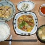 肉団子の酢豚、揚げとしいたけの玉子とじ、山芋の梅紫蘇サラダ、きのこと豆腐のお味噌汁 肉団子は豚肉のミンチで甘さ加減も良くてとても美味しかったです。サラダのすっぱさと山芋のシャリシャリ感がなんともいえず良かったです。