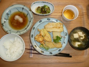 天ぷら、もずくときゅうりの酢の物、豆腐とワカメと大根のお味噌汁 天ぷらは魚(ちか)、たけのこ、ピーマン、なす、青さ、玉葱、海老のかきあげがありました。やはり旬のたけのこはダントツで美味しかったです。茶粥もありました。私は朝茶粥を食べたので白米にしました。お昼から天ぷらとは豪華なランチでした。