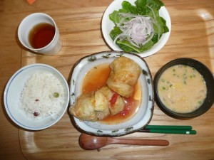 豆ご飯、ロールキャベツ、玉葱とサラダ菜のサラダ、大根と豆腐と白菜の呉汁風味噌汁 呉汁風が美味しくて懐かしかったです。おふくろの味です。豆ご飯も珍しく美味しく炊けていました。玉葱にサラダみ苦味もなくあっさりしてとても美味しかったです。
