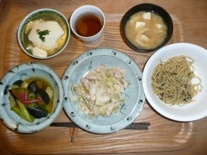 冷やし豚しゃぶきゅうり玉葱添え、なすとなんきんとアスパラの揚げびたし、おぼろ豆腐、豆腐と玉葱と揚げのお味噌汁 二種のスパゲティー 一段と暑い今晩は豚しゃぶでした。お野菜がたっぷりかかっていて美味しかったです。揚げびたしのおなすがなんとも美味しい。大好きです。ご飯のかわりにお昼のスパゲティーを再び頂きました。私は何度食べても好きです。