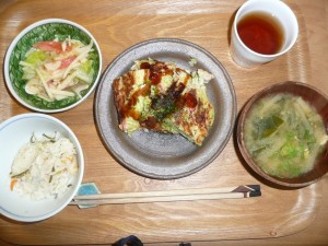 お好み焼き、りんごとトマトとレタスのサラダ、ワカメと豆腐と大根のお味噌汁、かやくご飯、きゅうりの漬物 かやくご飯の具はこぶに人参に生姜でした。お好みを一切れおかわりして、ご飯まで食べてしまいました。お昼からお腹が一杯です。お好みは山芋が多く入っているせいか、ふわふわでやわらかで美味しかったです。