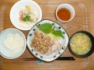 蒸し鶏の薬味ソースがけ、きゅうりと山芋とトマトのサラダ、はるさめと人参と玉葱と玉子のスープ 私ははるさめの入ったスープがなんだかつるつるして大好きです。薬味ソースがいつもですが美味しいです。ここのシェフのお得意ですね。