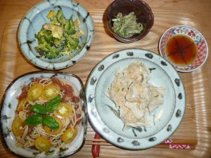 冷製パスタトマト味、ゴーヤチャンプル、いんげんの胡麻和え、しゅうまい チャンプルのゴーヤは我がマンションで採れた自家製でした。少し苦味があってとても美味しかったです。夏を感じます。パスタもにんにくが良く効いていて美味でした。しゅうまいも相変わらず旨いです。