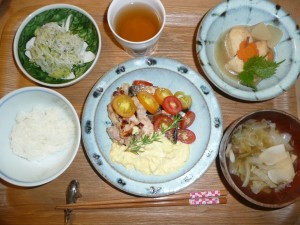 鶏肉と秋刀魚のムニエルタルタルソースがけ、豆腐揚げとしいたけと大根の炊き合わせ、釜揚げちりめんときゅうりのポン酢和え、玉葱とキャベツときのこのお吸い物 ムニエルのソースの上には自家製のトマトが綺麗にのっていました。タルタルソースはいつも美味しく食欲が湧きます。今日も鶏肉と秋刀魚と沢山頂きました。後はお野菜を沢山むしゃむしゃと食べた感じです。