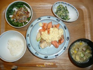シャケのムニエルタルタルソース掛けエリンギグリンアスパラ添え、大根餅、ほうれん草と白菜の胡麻和え、コーンスープ タルタルソースは玉子とマヨネーズの和えたものです。シャケにつけても野菜につけても美味しいです。スープにはコーンの他にオクラや玉葱やしいたけが入っていました。