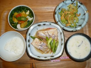 いとよりの煮付け、ゴーヤチャンプル、坊ちゃんかぼちゃと男爵芋と人参の煮物、豆乳汁 汁は白菜としいたけが入っていました。豆乳が凄く飲みやすかったです。久しぶりの白身魚の煮付け。美味しく頂きました。私は基本白身魚の煮付けが大好きです。一番はめばるそれからカレーやげたです。母が故郷に帰る度に煮付けを出してくれたのを思い出します。懐かしいな。子供の頃に戻ってみたいと思います。ゴーヤチャンプルはこの時期毎日でも食べたい一品です。