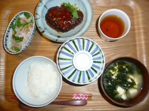 ハンバーグ、牛乳茶碗蒸し、はるさめサラダ、ワカメと豆腐となすのお味噌汁 茶碗蒸しはとろりとして口触りのいい優しいものでした。中にはしいたけやかまぼこや鶏肉が入っていました。ハンバーグはいつも通り美味しく頂きました。今日は何故がお昼に沢山食べたのでお腹がすいていず、少々残しました。