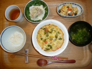 野菜グラタン、ツナと玉葱ときゅうりのサラダ、高野豆腐の玉子とじ、ワカメのお味噌汁 玉子とじにはシメジと人参が入っていました。今日は本当にお野菜たっぷりのメニューでした。グラタンも野菜とマカロニであっさりしたグラタンでした。ご飯は一口食べました。グラタンは半分残して明朝食べます。