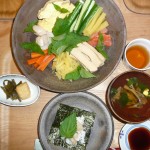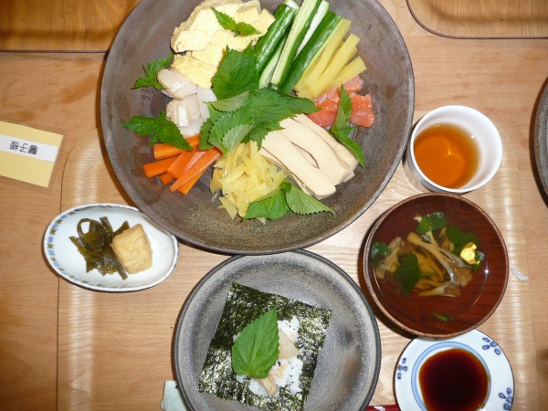 手巻き寿司、揚げ豆腐と茎ワカメの煮物、きのこと三つ葉のお澄まし 手巻きの具はスモークサーモンと貝柱と玉子ときゅうりと人参とおしんこと高野豆腐でした。紫蘇の葉も入れて巻いて食べると美味しかったです。際限なく食べれそうでした。危ない危ないグット我慢しました。