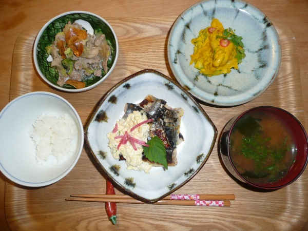 秋刀魚の塩麹ムニエルタルタルソースがけ、白菜と豚肉の炒め物ガーリックスライスがけ、なんきんサラダ、ワカメとシジミのお味噌汁 秋刀魚のタルタルソースにらっきょが入っていてとても美味しかったです。白菜と豚肉もガーリックと一緒に食べると美味しさ倍増です。いつも通りなんきんサラダは美味でした。シジミのお味噌汁もだしが良く出ていてそれはそれは美味しかったです。