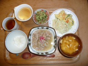 冬瓜と豚ミンチの煮込み、ポテトサラダキャベツ添え、きゅうりと冥加の胡麻酢の物、かぼちゃと揚げのお味噌汁 豆花 冬瓜の煮込みはとてもヘルシーな感じがしました。豚肉と良く合います。サラダもキャベツが沢山添えられていてムシャムシャと食べました。今日は嬉しいことにデザートがありました。豆乳でつくられた豆花です。アジア圏の外国に行ったらよく目にする感じのデザートです。とてもやわらかくて美味しかったです。