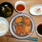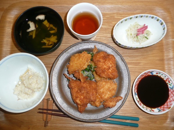 玉葱と鶏肉のフライ、大根ときゅうりの酢の物、ワカメとシメジのお澄まし、茗荷ご飯 今日のヒットはなんといっても珍しい冥加ご飯です。揚げが一緒に炊かれていました。かすかな茗荷の香りと味がなんとも言えず美味しかったです。フライも揚げたてで頂きお昼からご馳走でした。玉葱のフライはいつ食べても美味しいですね。