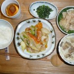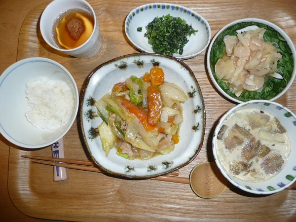 八宝菜、ほうれん草の胡麻和え、玉葱と帆立のマリネ、焼きナスの茶碗蒸し 今晩のヒットは茶碗蒸しでした。見た目は少しどす黒くなっていましたが、焼きナスの香りが一面に広がりとても美味しい茶碗蒸しでした。これはいけると思いました。また食べたい一品です。見た目は気にしません。マリネも玉葱と帆立がよく合っていて美味でした。八宝菜には豚肉やなんきんや人参やしいたけや白菜が入っていて野菜たっぷりでした。今晩は本当にお野菜たっぷりのヘルシーメニューでした。こんな日は気分もいいです。