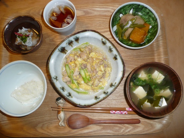 鶏肉の玉子とじアスパラ添え、なんきんと里芋といんげんの煮物、大根おろし、豆腐とワカメと冥加のお澄まし 玉子とじの味付けには山椒が使われていてとても美味しかったです。お澄ましの茗荷もしゃりしゃりしていていい感じでした。たまの大根おろしもいいです。
