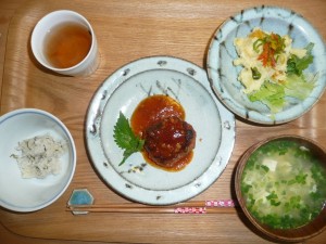 ハンバーグ、ポテトサラダなんきん入り、豆腐と玉子とにらのスープ、紫蘇ご飯 いつも美味しいハンバーグはお昼から二個も頂きました。珍しい紫蘇ご飯もにらのスープもとても美味しかったです。
