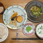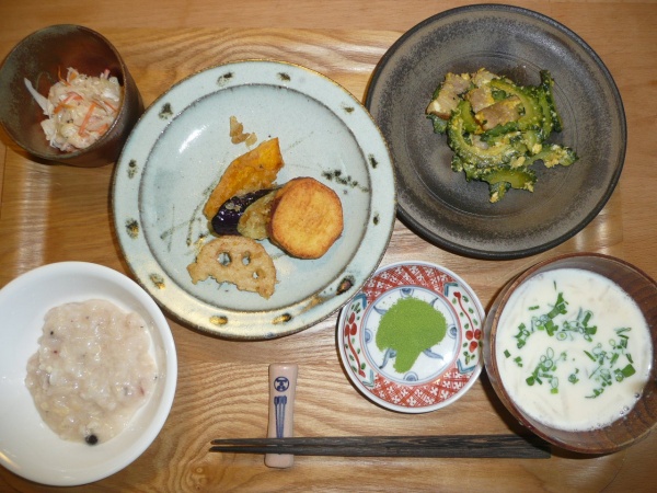 天ぷら(アジ、なんきん、さつまいも、レンコン、なすび)、キャベツと人参のコールスロー、ゴーヤチャンプル、ちーずのリゾット、豆乳スープキノコ入り 今日はお昼から天ぷらと豪華でした。私はなすびやレンコンがとても好きです。ゴーヤチャンプルもあまり苦くなくとても美味しかったです。チーズリゾットは最近もありましたがチーズの種類が違うそうです。濃厚でオリーブのピクルスをのせて食べました。異国の味がしました。