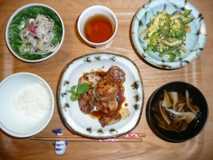 しゅうまいのレンコンはさみ焼き、大根となすの梅味噌和え、ちくわのゴーヤチャンプル、きのこのお澄まし 今日は珍しいはさみ焼きでした。しゅうまいもレンコンと良くあっていて美味しかったです。毎日食べたいゴーヤチャンプルは残り少ない夏ですが、今日も美味しかったです。豚肉じゃなくてもちくわでも充分美味でした。梅味噌和えは酸っぱくて体に良さそうでした。
