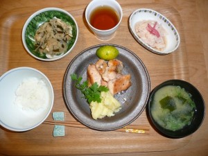 さけのムニエルマシュポテト添え、切り干し大根、れんこんの梅酢和え、わかめとさつまいものお味噌汁 マッシュポテトは久しぶりでマヨネーズの味でとても美味しかったです。切り干し大根も揚げと昆布が入っていて甘くやわらかく煮られていました。梅酢の酸っぱさもいかにも体に良さそうでした。