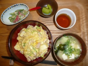 親子丼、やまいもとおくらとえのきの和え物、豆腐とワカメとさつまいものお味噌汁 キウィ 久しぶりの親子丼がお肉もやわらかくて美味しかったです。私は調子にのってご飯を沢山入れてしまいました。今日だけはおおめにみてください。夜からまたダイエットしますから。