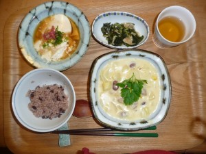 クリームシチュー、おぼろ豆腐、わかめとれんこんとおくらの酢の物、お赤飯 シチューには豆とコーンが沢山入っていて美味しかったです。酢の物もねばねば感があってなかなかでした。今日は誰かのお誕生日でお赤飯を頂きました。皆さんお年を召していますがお元気です。