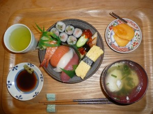 にぎり寿司(まぐろ、いか、サーモン、いくら、穴子、玉子焼、海老、トロたく巻き)、揚げ豆腐と玉子のおすまし、柿、バームクーヘン 今日は豪華にお寿司をとってくれました。お寿司はいつ食べても美味しいですね。一人前1180円です。8階でとれた柿も美味しかったです