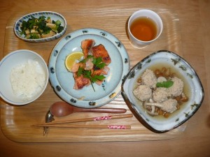 さけのムニエル、揚げと小松菜の炒り煮、海鮮肉団子ときのこのスープ、チーズケーキチョコレート入り 久し振りのお魚が美味しかったです。塩加減も丁度良かったです。スープは肉団子が海老と貝柱が入っていて香港を思い出す肉団子でした。クリスマス会に出された美味しいケーキを頂きました。手作りだからとても美味しいですね。