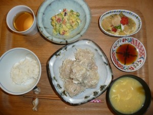菊花シュウマイ、高野豆腐と蕗と人参の玉子とじ、豆入りポテトサラダ、白菜とコーンの玉子スープ、お団子 今日も私の好きなミンチの料理シュウマイでした。大きいのを5個頂きました。それからこの時期に春を感じる蕗はとても嬉しかったです。高野豆腐も蕗も凄く味もよくて美味しかったです。コーンスープ はいつもながら体が暖まって美味しいです。デザートにはお団子を3個頂きました。