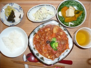 豆入りビーフシチュー、なんきんと豆腐揚げの煮物、山芋の梅アボマヨ和え、漬物 ビーフシチューには沢山の豆やビーフがそしてじゃがいもや人参が入っていてとても美味しく頂きました。山芋にはアボガドと一緒に梅とマヨネーズで和えられていてとてもいいお味を出していました。