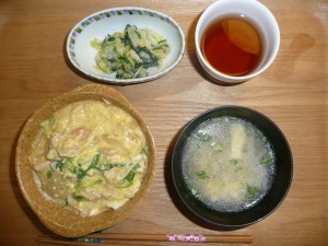 親子丼、白菜とほうれん草の胡麻和え、大根としいたけとさつまいもと揚げのお味噌汁、お漬物 親子丼はお肉も玉子も凄くやわらかくて私の大好きな丼でした。昔よく玉子丼を大学の学食で食べたことを思い出します。