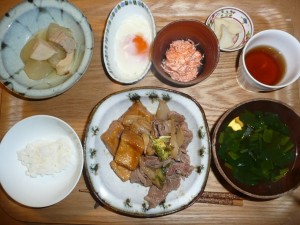 すき焼き風高野豆腐、人参サラダ、温泉玉子、大根とはんぺんとちくわの煮物 ほうれん草のお吸い物、漬物 すき焼には白菜と玉葱とお肉と高野豆腐が入っていて甘く煮られていて美味しかったです。人参サラダはシンプルでとても良いお味でした。今日の温泉玉子はお醤油を入れて頂きました。丁度良い具合に出来ていました。デザートにさつまいものケーキとクリーミーな甘酒を頂きました。個人的には今花粉症で鼻と目にきて苦しいです。