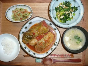 ロールキャベツケチャプ味、小松菜と揚げの煮浸し、きゅうりと大根と人参の酢の物、山芋入りお味噌汁豆腐玉葱いり お漬物 いかなご ロールキャベツはキャベツが柔らかく煮られていてとても美味しかtたです。味噌汁の山芋のねばりも良かったです。なんといっても副菜に出てきたシェフのお母様手作りのいかなごは最高においしかったです。やわらかくて味も丁度よくて。母の味を食べられて幸せだな。
