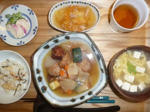 肉団子の甘酢、白菜とツナの煮物、豆腐といかなごと玉子のお澄まし、豆と揚げと昆布の炊き込みご飯 あやめゆきのお漬物 今日は念願の肉団子を作って頂き感激しています。やっぱりシェフの作る肉団子の甘酢は最高でした。味がとにかくいいのです。お野菜もたっぷり入っていました。白菜がオレンジ色をしていて甘くてなんとも美味しい煮物でした。お澄ましもいかなご入りで美味しかったです。炊き込みご飯も具沢山で美味でした。