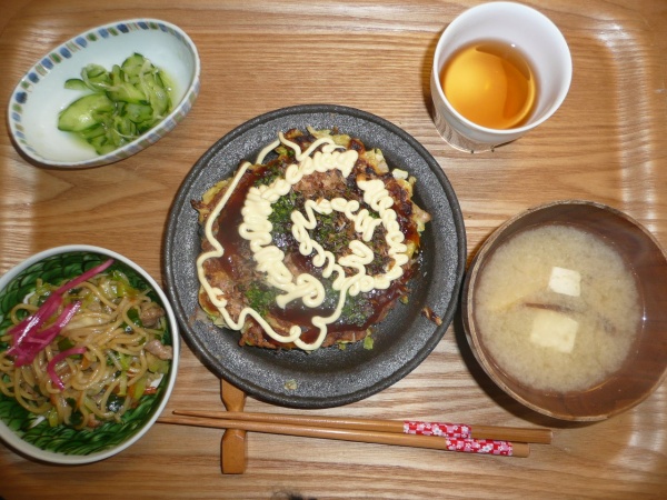お好み焼き、焼きそば、きゅうりと生姜の酢の物、豆腐と揚げとしいたけのお味噌汁 今日は屋台のようで楽しく美味しかったです。つい食べ過ぎてお好み焼きおかわりしました。お好み焼きはキャベツがたっぷりはいっていて美味しかったです。時にはこんな感覚の食事もいいですね。四月一日にふさわしいな。