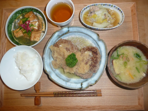 和風ハンバーグ大根おろし添え、厚揚げの煮物、白菜とさば缶の煮物、椎茸と人参とキャベツのお味噌汁 ハンバーグはよく出た来ますが和風は久方ぶりです。大根おろしと食べると美味しいです。今日は何故か2個食べられなくて残しました。この頃食べすぎです。白菜はトロトロでした。こういうの大好きです。今日はお昼軽く一時間食事の用意のボランティアをしました。時には楽しいですね。高校野球は龍谷大平安が優勝しました。38年ぶりとか。