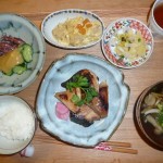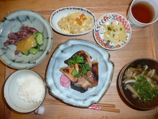 ブリの照り焼き、炒り豆腐、ホタルイカときゅうりの酢味噌和え、きのこのお澄まし 旬のホタルイカはとても美味しかったです。ブリは少々量が多くくてお持ち帰りしました。この頃お腹が一杯で体重も増加気味できをつけなければいけません。朝食を抜こうかな。