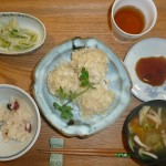 菊花しゅうまい、大根ときゅうりの酢の物、きのこと玉葱と人参とたけのこのスープ、豆ご飯 今日のしゅうまいは特大3個でした。いつもの二倍の大きさでした。スープは旬のたけのこが入っていて具沢山でした。豆ご飯もいいですね。