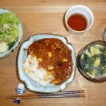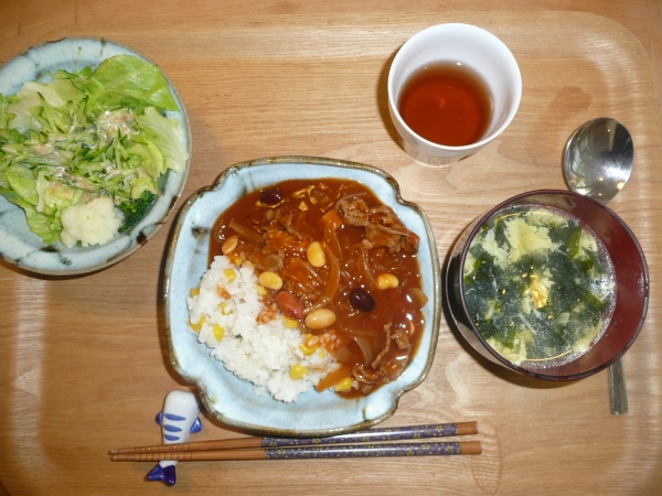 豆入りハヤシライス、レタスときゅうりとカリフラワーとブロッコリーのサラダ、玉子とわかめのスープ ハヤシライスのライスはコーン入りでした。ぶつぶつとして美味しかったです。ルーはおかあわりしました。食後に利用者さんからいた