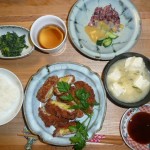 サツマイモのはさみ揚げ、ほうれん草の胡麻和え、ほたるいかときゅうりの酢味噌和え、豆腐と大根のお味噌汁 はさみ揚げはさつまいもを豚肉で巻いて揚げてありました。お好みのソースで頂きました。ほたるいかはやはり旬ですからいつ食べても美味しいですね。