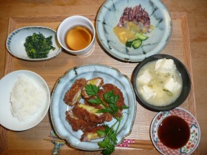 サツマイモのはさみ揚げ、ほうれん草の胡麻和え、ほたるいかときゅうりの酢味噌和え、豆腐と大根のお味噌汁 はさみ揚げはさつまいもを豚肉で巻いて揚げてありました。お好みのソースで頂きました。ほたるいかはやはり旬ですからいつ食べても美味しいですね。