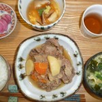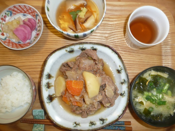 肉じゃが、おぼろ豆腐、揚げとワカメとキャベツのお味噌汁、お漬物 今日の肉じゃがの牛肉は特選スライスで凄くやわらかくて美味しかったです。やはりいいお肉はいいです。おぼろ豆腐もしいたけ入りでした。お昼はこのくらいの量が丁度いいです。