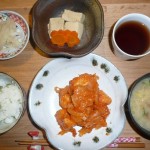 玉葱入りエビチリ、高野豆腐と人参の煮物、なめこと白菜のお味噌汁、豆ご飯、白菜の漬物 今日の海老は特大でした。プリプリとしていて美味しかったです。お味噌汁は私の好きななめこでした。ご飯もグリーンの豆ご飯で美味しかったです。