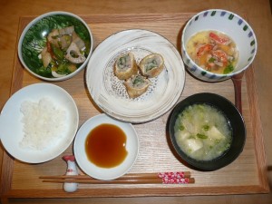 豚じゃがロール大葉入り、蓮根とちくわとキャベツの煮物、海老のあんかけ茶碗蒸し、大根と揚げと豆腐のお味噌汁 豚じゃがはまるで一見春巻きのようでした。中に大葉が入っていてとてもいい香りがしてポン酢で頂きましたが、凄く美味しかったです。8個も頂きました。少し食べ過ぎたかな。茶碗蒸しも海老ときのこのあんかけでとても美味でした。