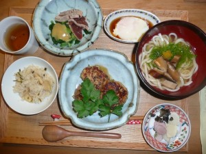 和風ハンバーグ、もどり鰹のたたきとぬたの酢味噌和え、温泉玉子、しいたけ入りおうどん、竹の子ご飯 ハンバーグのつなぎはライスなので凄くやわらかいハンバーグでした。中に大葉が入っていました。ぬたやおうどん美味しかったです。なんといっても旬の竹の子ご飯嬉しかったです。