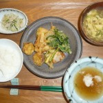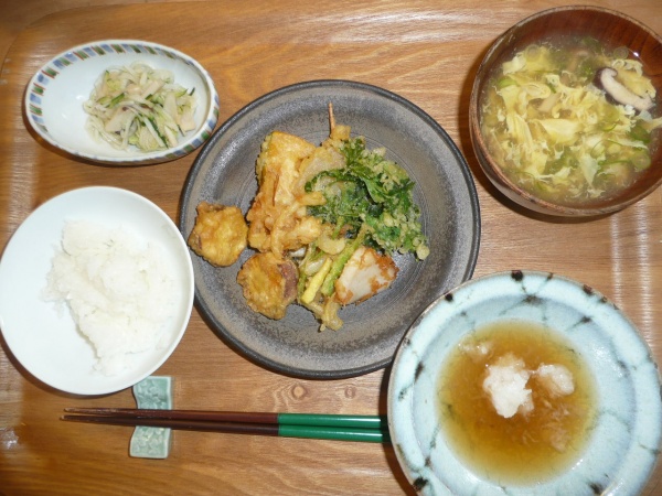 天ぷら(貝柱、かますご、さつまいも、かきあげ、イタリアンパセリ、玉葱)きゅうりとエリンギと大根の酢の物、しいてけのかきたま汁 今日は午前中歯医者に行っていたので揚げたてを食べることはできませんでしたが、それぞれ天ぷらは美味しかったです。特に