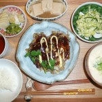 おこ玉焼き、コールスロー、胡麻豆腐のあんかけ、豆腐入り豆乳汁 おこ玉焼きとは一見お好み焼きですが、中身はミンチと沢山の玉葱でした。なので玉葱焼きですね。お好み焼きのソースとマヨネーズで頂きました。私は好きですね。胡麻豆腐はわさびで頂きました。豆乳汁も豆腐とよく合っていて美味しかったです。